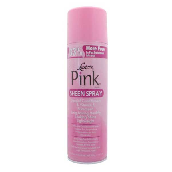 for relaxed, pressed and natural hairstyles, Pink Oil Sheen Spray's pleasantly light formula contains conditioners, natural oils, vitamins and sunscreen.
