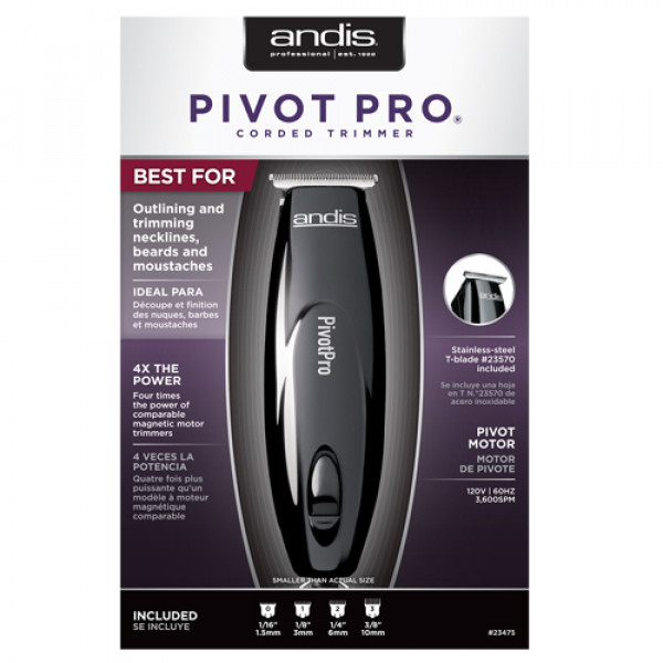 The Andis Pivot Pro Trimmer features twice the power of a magnetic motor clipper. Ideal for trimming beards, mustaches, outlining and touch-ups around ears. Contoured to fit comfortably in your hand and fine cutting teeth for extremely close trimming. Includes four attachment combs sizes: 1/16", 1/8", 1/4", 3/8".